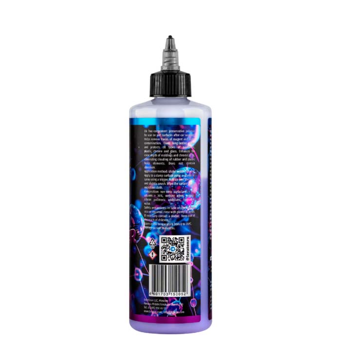 Двухкомпонентный полимер-консервант для использования на влажных поверхностях после мойки автомобиля. Способствует очищению от следов реагента и статических загрязнений. Придает длительный блеск и защищает все виды ЛКП, пластик, хром и стекло. Усиливает глубину цвета молдингов и хромированных деталей, исключая помутнение резины и пластиковых элементов кузова. Не содержит абразивов.