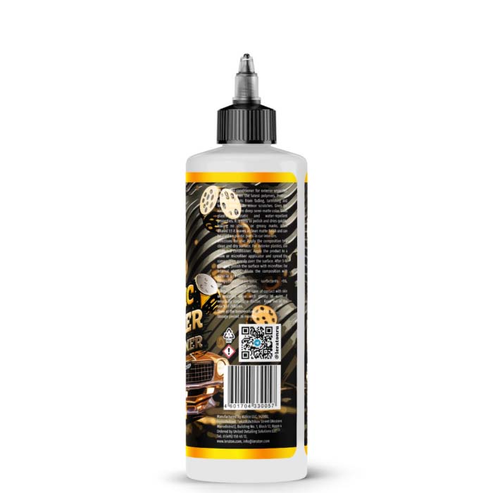 Восстановитель-кондиционер для внешнего неокрашенного пластика на основе новейших полимеров. Защищает пластиковые элементы от выгорания, потускнения и потери блеска. Заполняет мелкие царапины. Придает поверхности равномерный глубокий полуматовый цвет. Наделяет пластик антистатическими и водоотталкивающими свойствами. Легко располировывается и быстро высыхает, не оставляя разводов и жирных следов. При разведении 1,1 оставляет чистый матовый финиш и может использоваться для пластиковых элементов в салоне автомобиля.