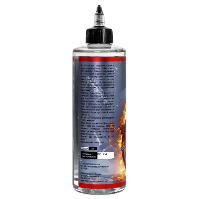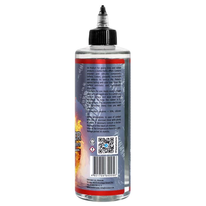 Состав для придания шинам и резиновым изделиям стойкого матового эффекта. Содержит полимерные и силиконовые соединения. Смягчает резину и предотвращает появление микротрещин и продлевает ее срок службы. Защищает от выгорания и потери цвета. Наделяет поверхность антистатическими и гидрофобными свойствами.