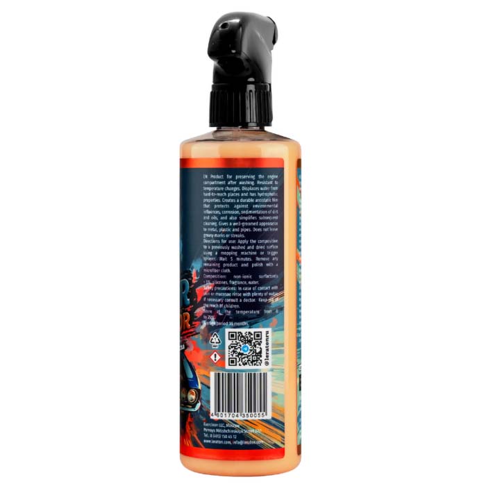 Состав для консервации подкапотного пространства после мойки. Устойчив к перепадам температур. Вытесняет воду из труднодоступных мест и обладает гидрофобными свойствами. Создает стойкую антистатическую пленку, которая защищает от влияния окружающей среды, коррозии, осаждения грязи и масел, а также упрощает последующую очистку. Придает ухоженный вид металлу, пластику и патрубкам. Не оставляет жирных следов и разводов.