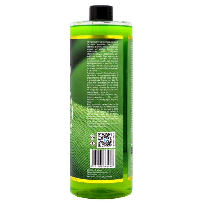 Высокопенный концентрированный состав для очистки изделий из ткани (сиденья, декоративные вставки) без фосфатов, растворителей и щелочи. Содержит только быстроразлагаемые активные компоненты, эффективно устраняющие загрязнения. После применения придает ткани антистатические свойства. Подходит для очистки серьезных загрязнений с пластика при разведении водой 1,20. Перед применением необходимо проверить воздействие средства на незаметном участке поверхности.
