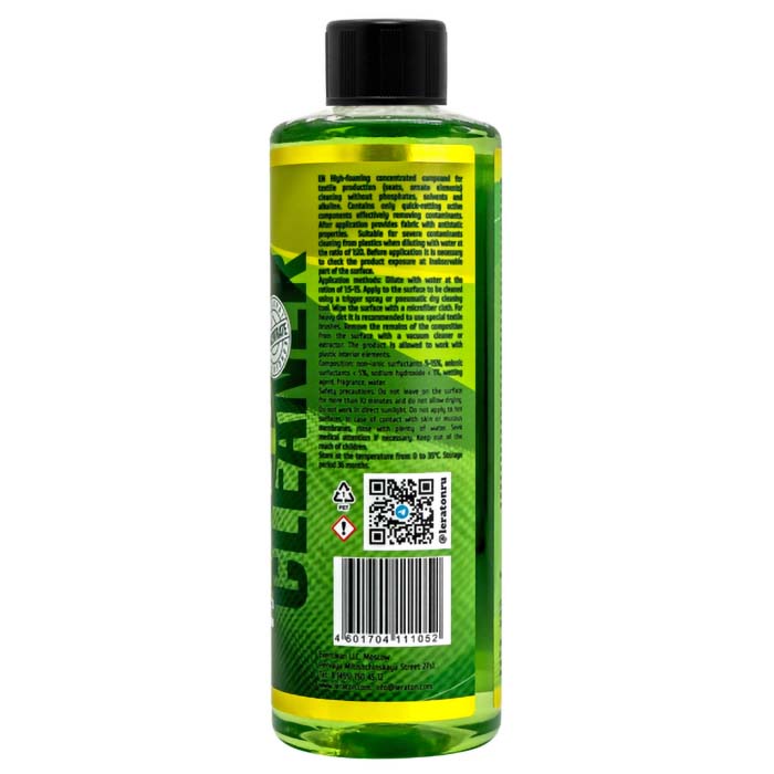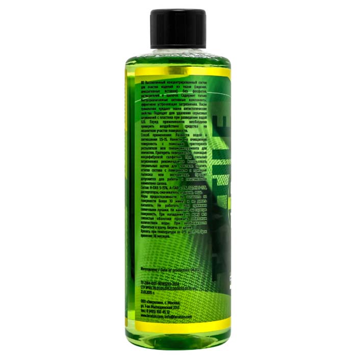 Высокопенный концентрированный состав для очистки изделий из ткани (сиденья, декоративные вставки) без фосфатов, растворителей и щелочи. Содержит только быстроразлагаемые активные компоненты, эффективно устраняющие загрязнения. После применения придает ткани антистатические свойства. Подходит для очистки серьезных загрязнений с пластика при разведении водой 1,20. Перед применением необходимо проверить воздействие средства на незаметном участке поверхности.
