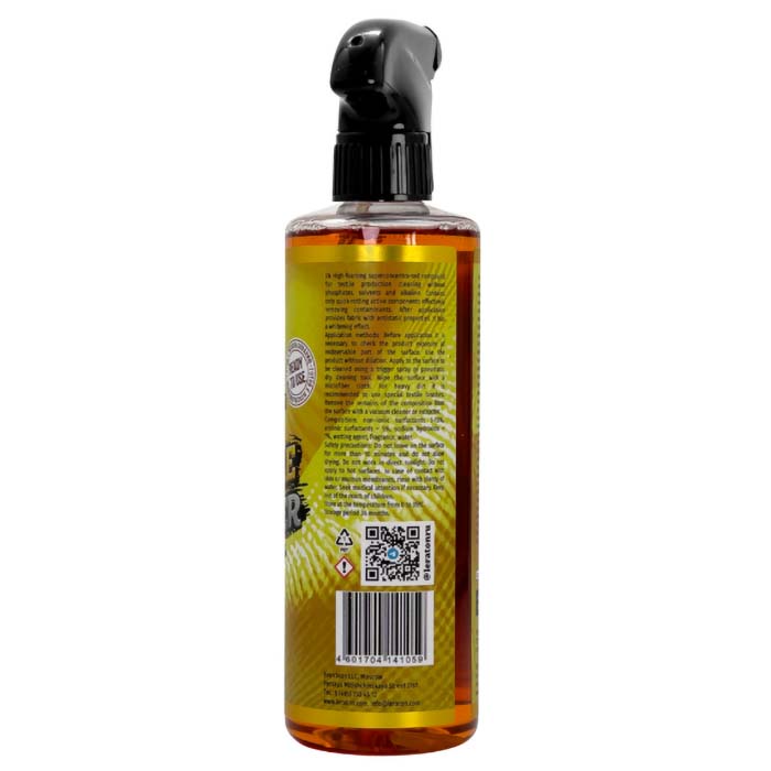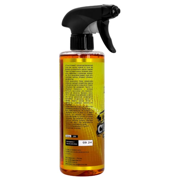 Высокопенный суперконцентрированный состав для очистки изделий из ткани (сиденья, декоративные вставки, ковры) без фосфатов, растворителей и щелочи. Содержит только быстроразлагаемые активные компоненты, эффективно устраняющие загрязнения. После применения придает ткани антистатические свойства. Обладает отбеливающим эффектом.