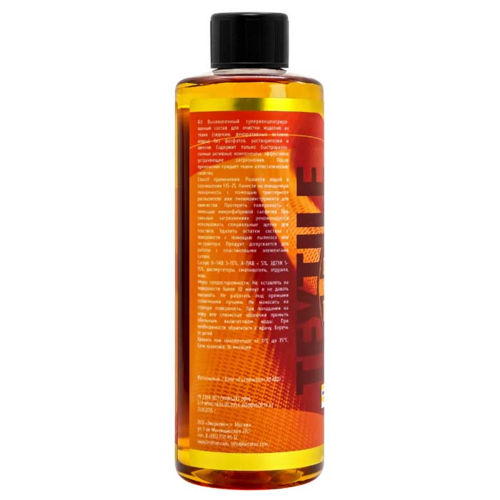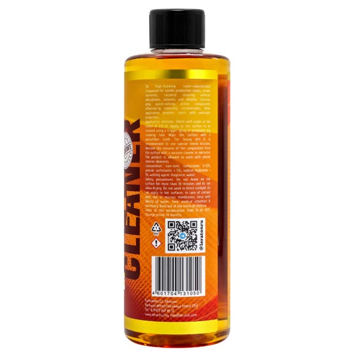 Высокопенный суперконцентрированный состав для очистки изделий из ткани (сиденья, декоративные вставки, ковры) без фосфатов, растворителей и щелочи. Содержит только быстроразлагаемые активные компоненты, эффективно устраняющие загрязнения. После применения придает ткани антистатические свойства. Обладает отбеливающим эффектом. Подходит для удаления серьезных загрязнений с пластика при разведении с водой 1,35.